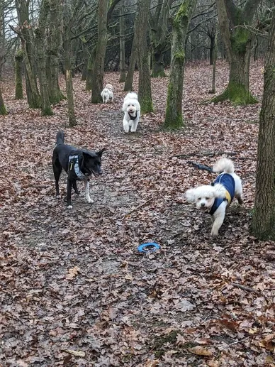 We all want the same thing for our dogs when we can’t be with them – a safe pair of hands to care for them. Lots of affection, attention and a lovely long walk are also vital :). That’s what we offer here at our small, friendly and highly experienced daycare in Borehamwood. We are tucked away in a quiet cul- de-sac right by  the beautiful Red Road Park.  With rolling fields and woods, it’s a real paradise for pooches! We offer all the comforts of home, with large squashy sofas and luxurious pet beds, plus a secure and private garden. Our ethos is simple: we provide the type of care we would want our own dogs to experience. And because we keep our numbers low, and there are two of us always here, each dog enjoys a level of attention that is unrivalled and really valued by our clients.